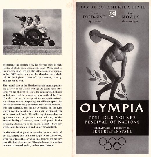 Die Olympiafilme von Leni Riefenstahl wurden nicht nur in Deutschland ein Erfolg, sondern weltweit aufgeführt und durften natürlich nicht zur Unterhaltung auf einem Kreuzfahrtschiff der HAPAG fehlen.