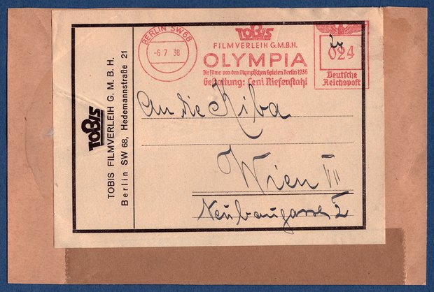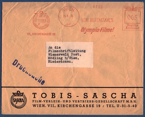 Aber es gab auch die direkte Niederlassung der T O B I S - S A S C H A als Film-Verleih- und Vertriebsgesellschaft mit Sitz in Wien, die natürlich die OLYMPIA – FILME von Leni Riefenstahl ebenfalls in ihr Repertoire nahmen und dazu auch im Absenderfreistempel warben, der hier mit Datum vom 24. 8. 1938 abgebildet werden kann.